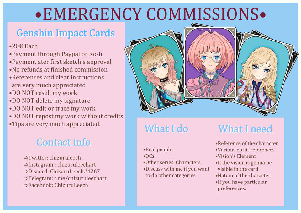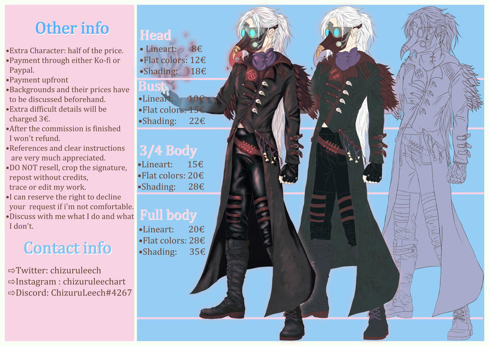 As I am in a rather bad economic situation I can't afford to hold a client's closed queue and will basically keep the commissions always open, please bear in mind that there might be other people's commission before yours and that for health issues i can't stay 24/7 before my computer screen drawing so please discuss with me if you have a specific deadline for your commission, otherwise it might take some time for me to complete, but stay sure i'll surely dedicate my time to your commission when your turn comes!